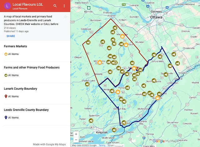 The Local Flavours Project includes an online map and printed brochure with information on 10 weekly markets and 38 farms, apiaries and sugar bushes. The online map can be found at FoodCoreLGL.ca and copies of the printed brochures have been distributed to farmers markets, municipal offices, food businesses and tourism offices across the region. The project was inspired by Lanark Local Flavour, a map and listing first created by EcoPerth which needed an update.
