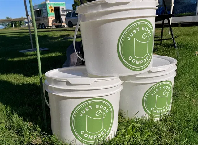 So, Just Good Compost provides households with a refurbished plastic bucket to collect household compostable food scraps, then picks up the containers on a weekly basis, leaving behind a clean container. The company then gets the scraps composted and in the spring hosts a Compost Day celebration where customer can collect finished compost for their gardens.