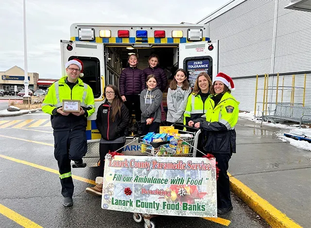 Every day, paramedics with the Lanark County Paramedic Service (LCPS) care for our community. Recently, they did so in a different way. On December 10th and 11th, throughout Lanark County, more than a dozen paramedics and their families, along with two local hockey teams – MTK U14 and APMHA U13A – held their annual “Fill an Ambulance with Food” drives in Almonte, Carleton Place and Perth.