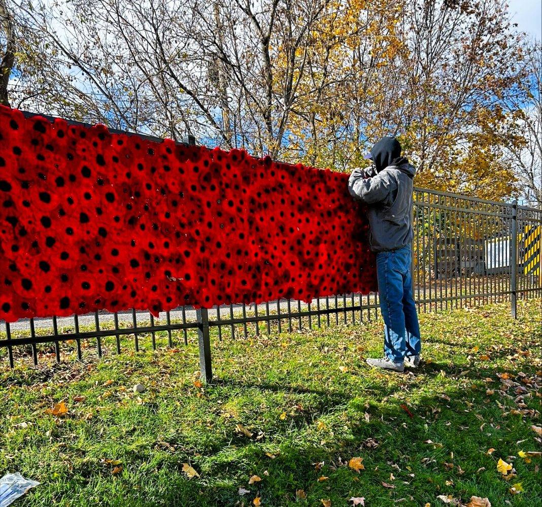 In 2024, over 300 people participated in this collaborative community project and created over 10,000 poppies (hand knitted and crocheted). Participants tied poppies onto netting, tacked down poppies so they remained in full bloom, installed and took down poppy displays across the municipality, and sewed cotton storage bags to protect the poppy displays (while in storage for future use).