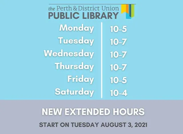 The Perth and District Union Public Library is pleased to announce newly expanded hours, starting Tuesday August 3. The new hours are Monday 10am-5pm, Tuesday/Wednesday/Thursday 10am-7pm, Friday 10am-5pm and Saturday 10am-4pm.