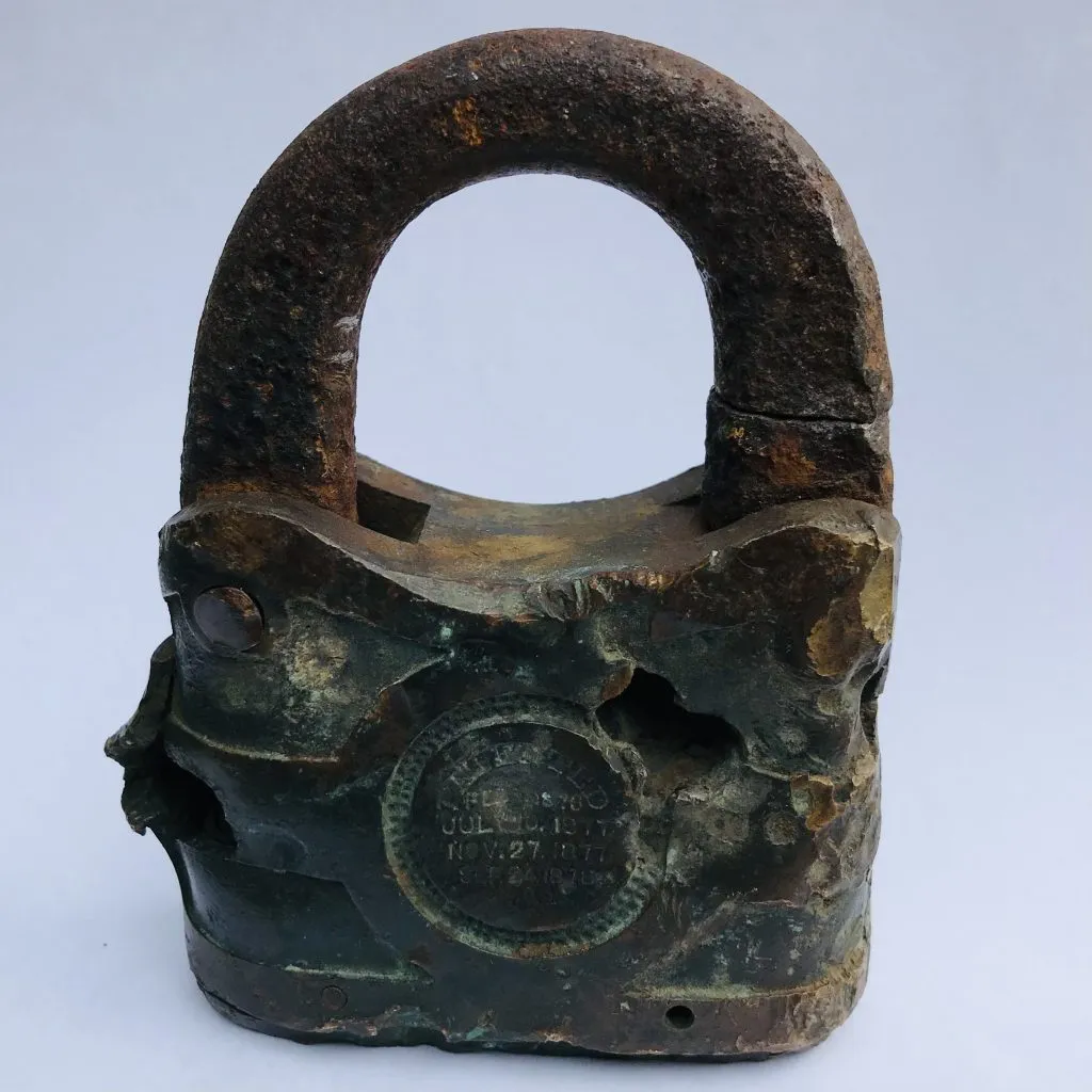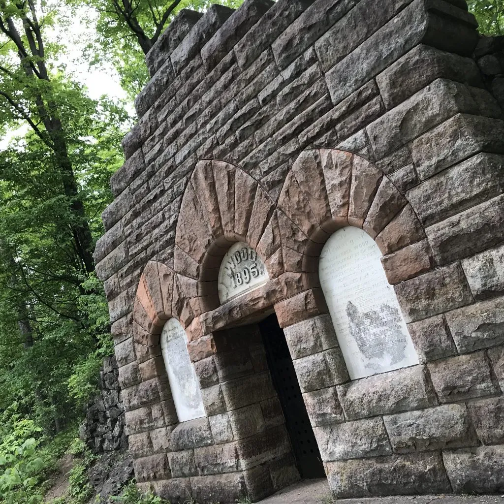 The next portion of this story is rather disturbing. The last burial at the Wood Cemetery and Mausoleum took place in 1949. After that, it was abandoned. Trees and brush grew up and the cemetery was lost to time. Locals forgot that it existed. Vandals broke a number of the gravestones and even smashed and opened a tomb. In October 1987, it was documented that multiple headstones were missing from the Wood Cemetery—including the headstones from three WWI veterans’ gravesites. A metal maple leaf marker was discovered and placed in the mausoleum, but later went missing. Numerous padlocks were broken by vandals breaking into the mausoleum; the original padlock even contains a bullet hole!