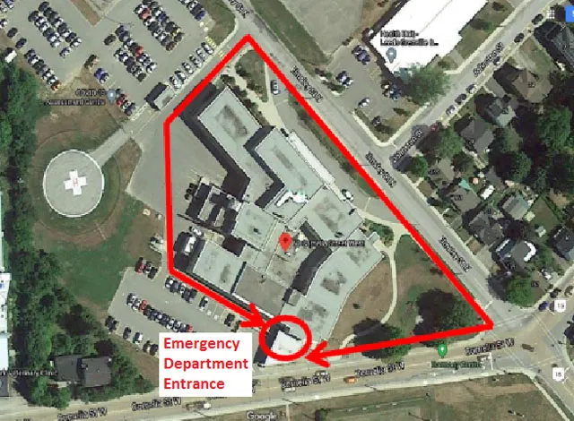 Please note that the front (main) entrance is not for public access/entry to the hospital at this time. The only point of entry to the hospital is the Emergency Department entrance located at 60 Cornelia Street West which can be accessed via the municipal sidewalk along Elmsley Street and Cornelia Street or behind the hospital via the Emergency Department parking lot.
